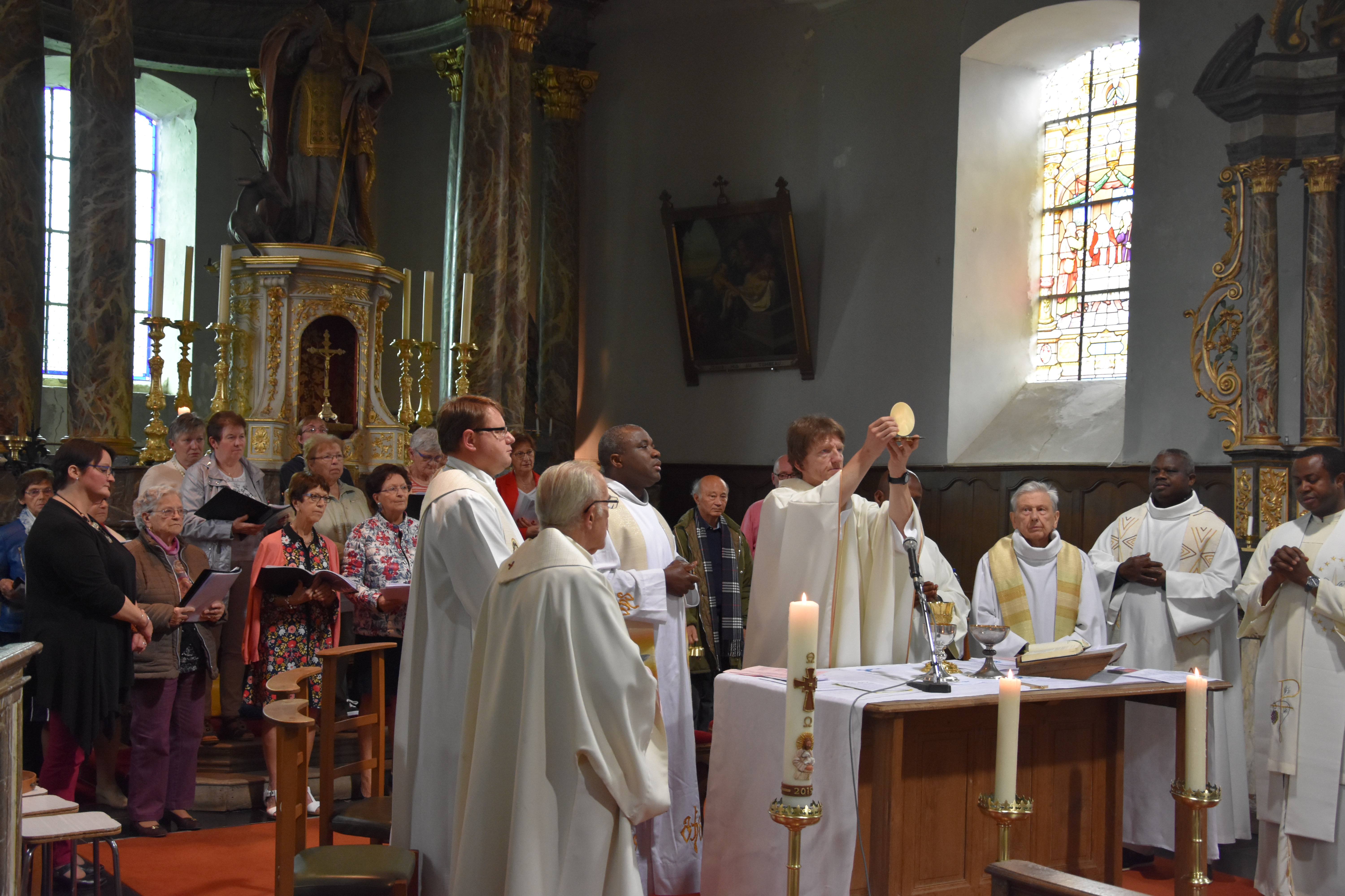 C’est l’abbé Bruno Robberechts, doyen de Leuze et formateur au Séminaire Notre Dame de Namur, qui a présidé l’eucharistie, entouré de nombreux prêtres du doyenné. Dans son homélie, il a expliqué l’importance du CIEL avec un C majuscule, comme un endroit, là où Dieu est présent. Il nous a invités à un voyage : aller vers un coin de Ciel qui est là dans notre coeur. A nous d’y découvrir la présence de Dieu qui nous accompagne ! En aimant gratuitement, notre vie va être bousculée, renouvelée si nous répondons « OUI » ! Cette expérience a été vécue également par les disciples ; ils ont compris que les choses avaient changé ! Notre société vit souvent aussi avec pas mal de fardeaux à porter. Un pèlerinage est l’occasion de chercher ce qu’il y a d’essentiel dans notre coeur. Jésus nous demande d’aimer comme lui jusqu’à donner de soi, jusqu’à donner sa vie ! Devenons des êtres de louange ! Comme on a besoin d’avoir un esprit de louange ! On se plaint souvent, on peut se rendre compte qu’avec un petit peu d’amour, quelque chose de merveilleux peut se produire ! Avec de l’espérance, on peut entrer dans le projet de Dieu.