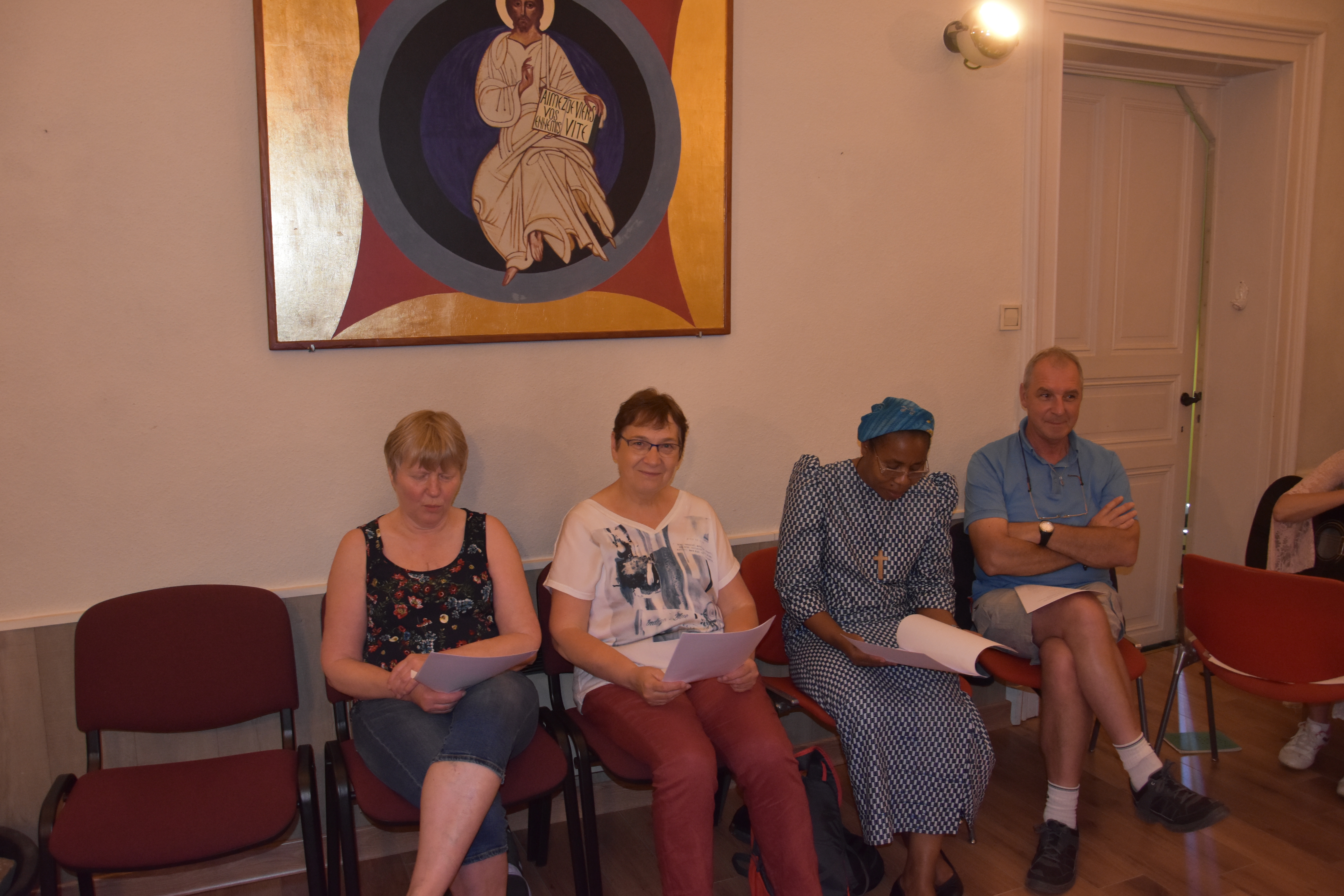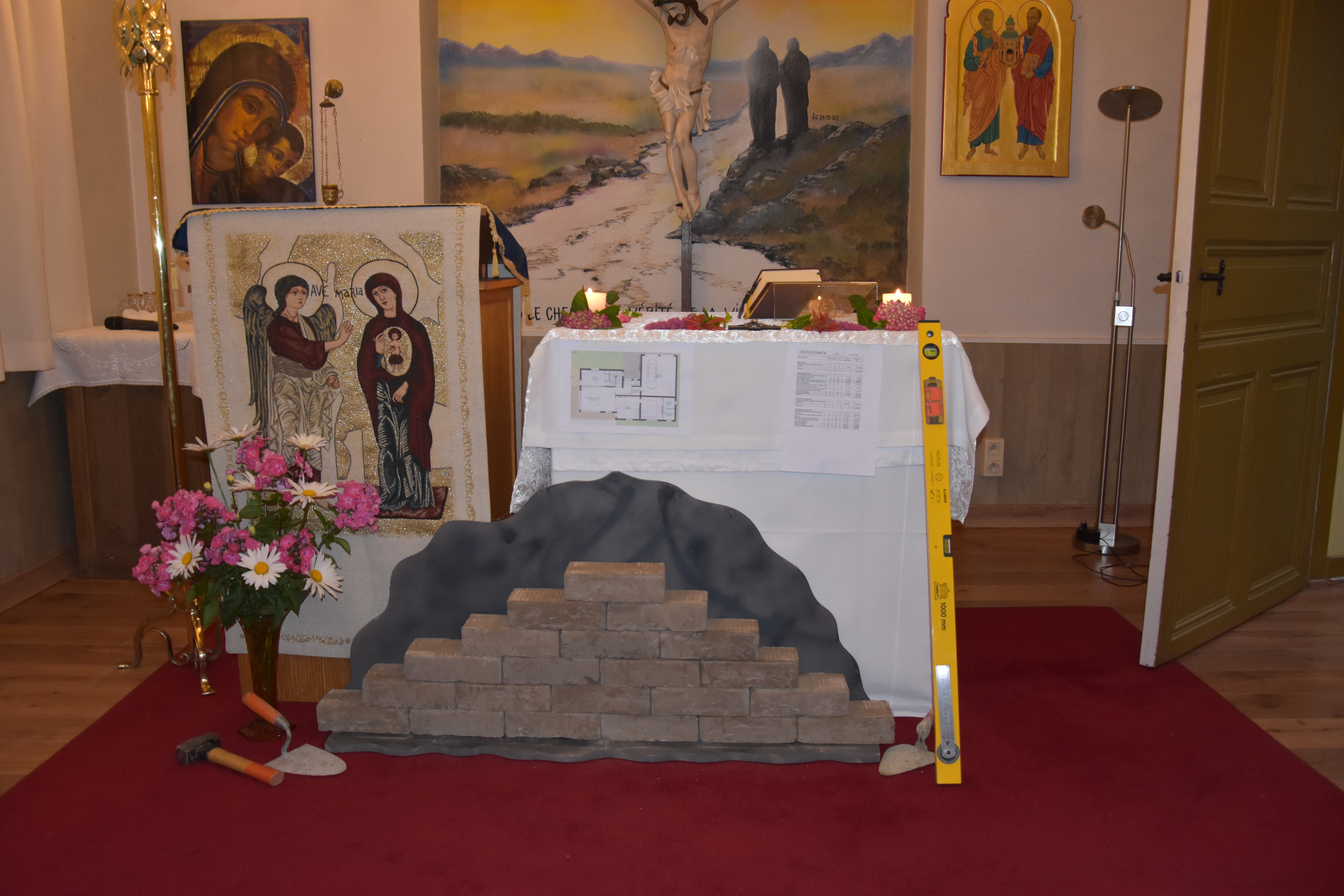 Au programme : une eucharistie célébrée par l’abbé Santiago, dans laquelle nous nous sommes dit merci mutuellement et avons dit merci au Seigneur pour toute cette année de bienfaits et de joies. Dans le cadre de la prière universelle, nous avons symboliquement apporté et confié au Seigneur, notre rocher sur lequel nous pouvons nous appuyer en toutes circonstances, tout ce qui a fait notre année spirituelle, pastorale et personnelle. Chacun a été invité à s’approcher pour bâtir ensemble la maison sur le roc. Les quatre dernières briques ont été déposées en union avec tous les collègues malades ou en difficultés, les malades de nos familles, avec toutes celles et tous ceux qui n’avaient pu être parmi nous, avec tous les anciens collègues et avec Rita, qui nous a quittés en août 2017.