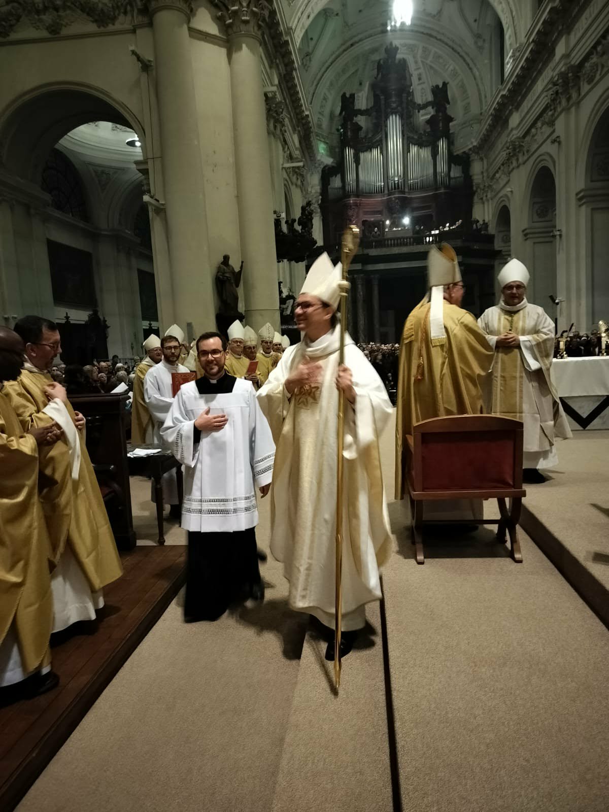 Et lorsque la procession entre dans la cathédrale, les fidèles restent sans voix convaincus qu’elle ne s’arrêtera jamais ! Elle est composée des acolytes, des diacres, des prêtres très nombreux, de représentants des abbayes du diocèse dont des pères abbés, des mères abbesses. Présents encore une vingtaine d’évêques de Belgique bien sûr mais aussi de France et du Grand-Duché de Luxembourg. Ils sont ainsi plus de 300 à s’installer dans le chœur de la cathédrale.