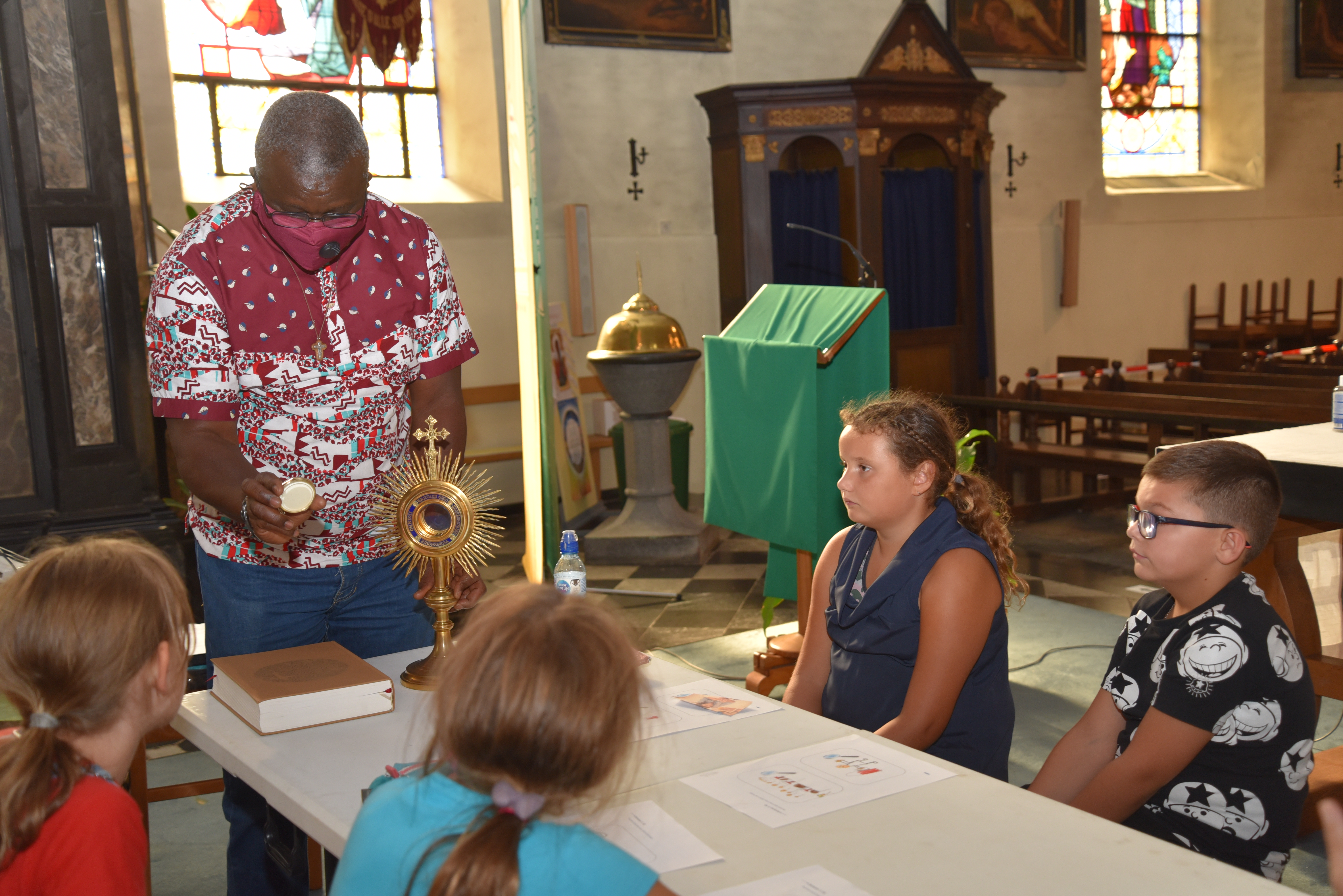 Nos catéchistes nous prennent en main et nos commençons par … dire bonjour à Dieu avec une prière et un chant. Normal, n’est-ce pas. C’est quand même lui qui nous invite. Nous entrons dans le sujet et nous devons expliquer des mots difficiles comme « initial », par exemple. Puis, nous dressons un tableau avec nos mercis. Cet après-midi, dans la joie et la bonne humeur, nous avons appris plein de choses nouvelles. Saviez-vous que la prière eucharistique comporte 9 étapes ? Nous n’avons pas perdu notre temps et, avec le père Jean-Pierre, nous avons fait connaissance avec l’adoration pendant la messe de clôture. Quand est-ce que nous pourrons recommencer ? Marc de Sugny