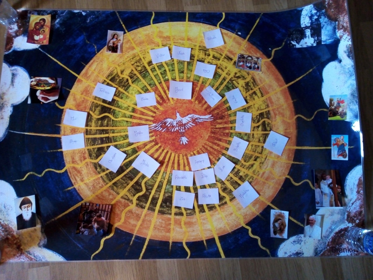 UP Gedinne Croix-Scaille => « Ce mercredi, les enfants qui vont fêter leur première communion début octobre ont passé l’après-midi à la découverte de la prière eucharistique. Au fil des activités et des chants, les enfants ont suivi les différentes étapes de cette prière. En photo, un beau grand panneau de l’Esprit Saint qui rassemble tous les vivants (enfants, catéchistes, prêtres, évêque) et les morts (Saints, Marie, Jésus,…) de notre Eglise. Malgré les circonstances, nous avons pu passer une bonne après-midi tous ensemble. Alors, merci aux enfants, aux catéchistes et à nos prêtres qui nous ont accompagnés!! » Madeline
