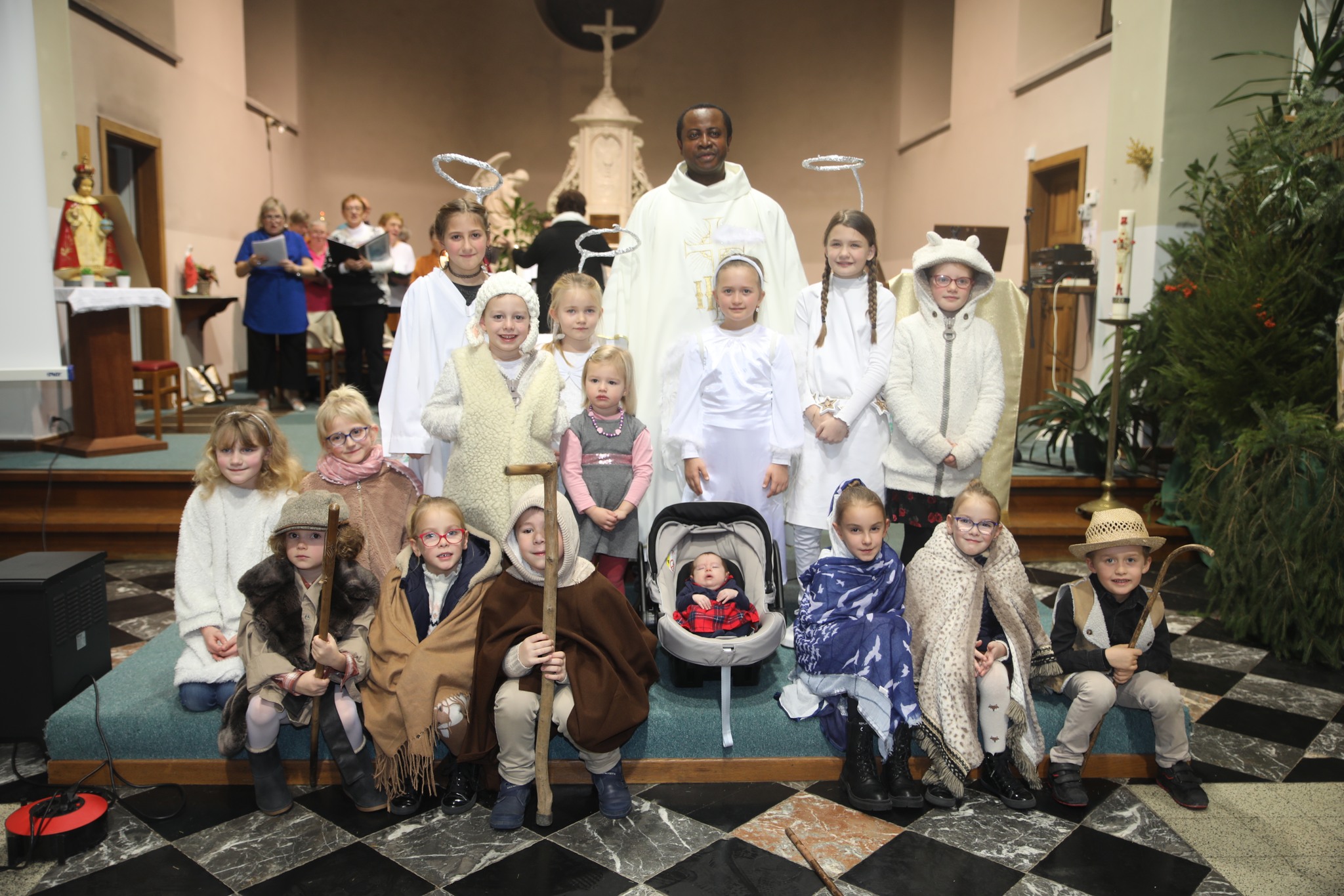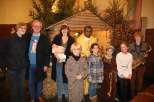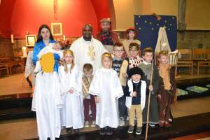 Pendant la célébration, les enfants ont eu la joie de participer à la reconstitution de la crèche vivante! Et ce ne fut pas sans émotions pour nos « petites têtes blondes » d’habiter Saint Joseph, Sainte Marie, les bergers, les moutons, les anges…Et notre petit Jésus me direz-vous ? Mais oui ! Parlons-en ! Adorable bien évidemment ! Merci et félicitations encore aux heureux parents de Léonie qui ont eu la gentillesse de nous présenter leur enfant presque nouveau né pour la réussite de la crèche bien vivante en cette joyeuse célébration de Noël animée par notre Doyen Casmir Nnubia.