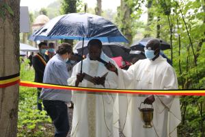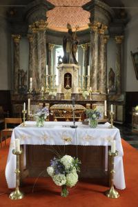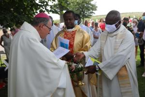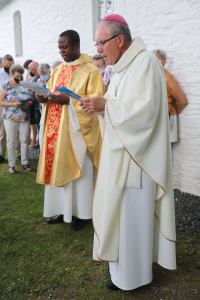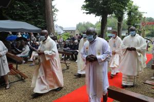 C’était donc jour de fête et de joie (même le soleil s’était mis sur son 31 🙂 ) ce dimanche 15 août 2021 à Oizy car … la chapelle Notre Dame du Bon Secours, rénovée suite à la tempête de 2018, a été inaugurée et bénie par notre évêque. Avant cela, une eucharistie, rassemblant de nombreux paroissiens et sympathisants, a été célébrée par Monseigneur Warin et des prêtres de notre doyenné dans l’église Saint Hubert ! Pour débuter la célébration, le doyen Casmir Nnubia, prêtre du secteur Bièvre/Daverdisse a prononcé un mot d’accueil et de bienvenue. Dans son homélie, notre évêque nous a invités à « plus résolument, vous tourner vers Marie, à, plus résolument, la prier, à, plus résolument, recourir à elle. » Il a insisté sur le fait que Marie visite aujourd’hui encore nos maisons, et le plus petit appel à l’aide de l’un de ses enfants ne doit pas la laisser insensible.