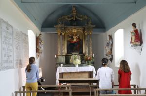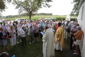 Après la messe, une procession a permis à chacun de rejoindre à pied la chapelle Notre Dame du Bon Secours. Ensuite, différents discours ont été prononcés par Michaël Modave, bourgmestre faisant fonction de la Commune de Bièvre et Sarah Lambot, employée au Centre de documentation/Bibliothèque. Dans son intervention, Monsieur Xavier de Voghel, a, quant à lui, remercié, au nom de la Fabrique d’Eglise de Oizy-Baillamont dont il est le président, « Madame Yvonne Piron, grâce à qui de très nombreux pèlerinages, de très nombreux moments de prière ont donné à ce haut lieu de notre village et de notre région une vie que nous aurons à cœur de faire perdurer encore de nombreuses années. Elle nous a transmis le flambeau non sans nous laisser bien des recommandations. Nous veillerons à ne pas trahir son empreinte à Oizy. » Un cadeau-souvenir et un bouquet de fleurs lui ont été remis. Monseigneur Warin a alors béni l’extérieur et l’intérieur de l’édifice rénové. Un tableau dont la thématique est l’Assomption de la Vierge ornait l’autel de la chapelle avant la tempête de 2018, mais, celui-ci a été dégradé par le temps mais surtout par les dégâts provoqués par la chute du tilleul. Une restauration splendide du tableau a été réalisée par l’artiste-peintre et restauratrice Marie-Marthe Haufferlin, moniale à l’Abbaye de Cordemois, non loin de Bouillon.