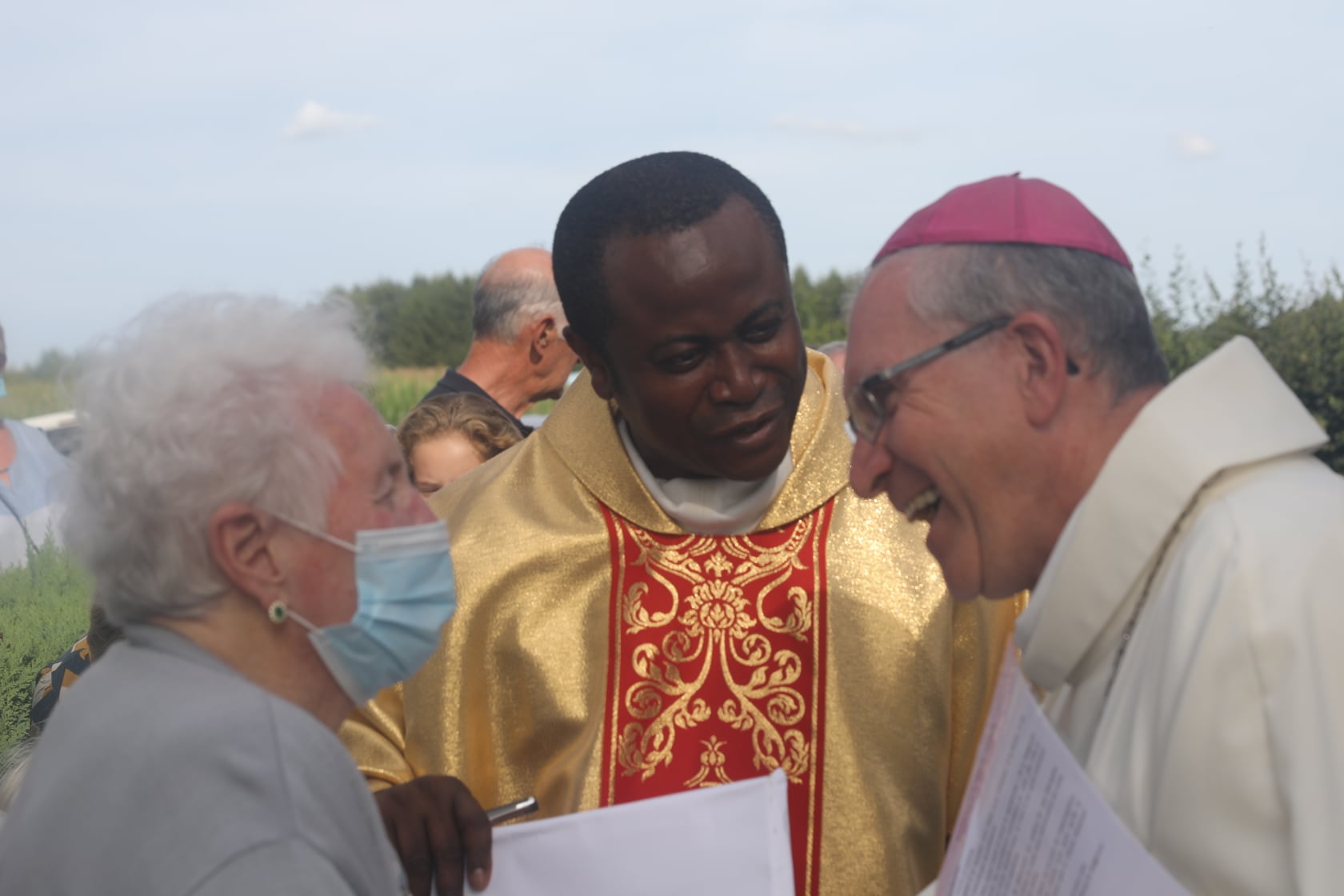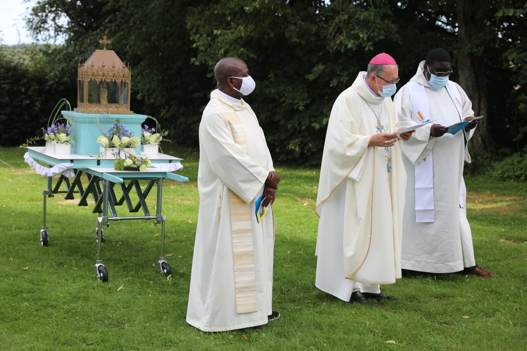 C’était donc jour de fête et de joie (même le soleil s’était mis sur son 31 🙂 ) ce dimanche 15 août 2021 à Oizy car … la chapelle Notre Dame du Bon Secours, rénovée suite à la tempête de 2018, a été inaugurée et bénie par notre évêque. Avant cela, une eucharistie, rassemblant de nombreux paroissiens et sympathisants, a été célébrée par Monseigneur Warin et des prêtres de notre doyenné dans l’église Saint Hubert ! Pour débuter la célébration, le doyen Casmir Nnubia, prêtre du secteur Bièvre/Daverdisse a prononcé un mot d’accueil et de bienvenue. Dans son homélie, notre évêque nous a invités à « plus résolument, vous tourner vers Marie, à, plus résolument, la prier, à, plus résolument, recourir à elle. » Il a insisté sur le fait que Marie visite aujourd’hui encore nos maisons, et le plus petit appel à l’aide de l’un de ses enfants ne doit pas la laisser insensible.