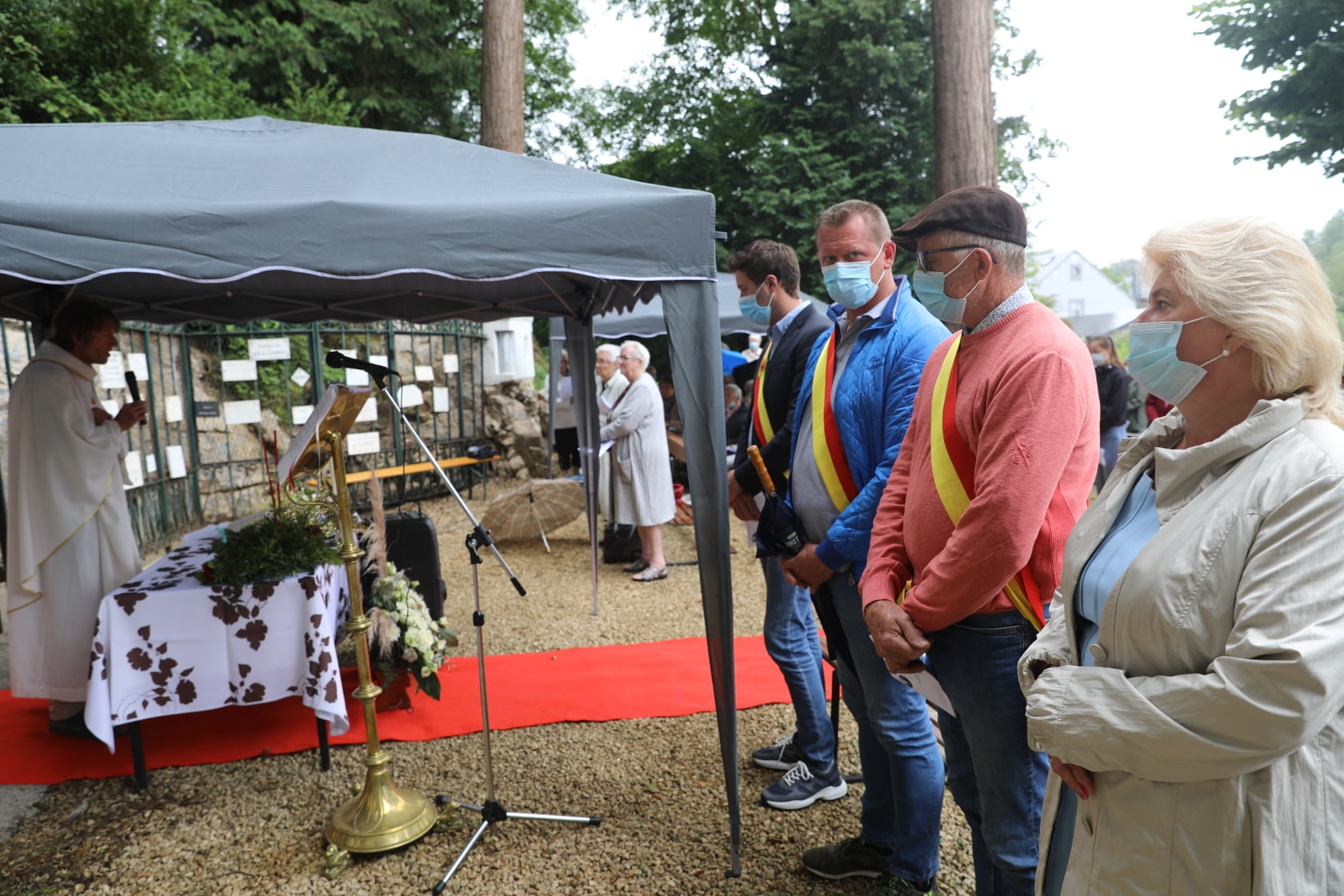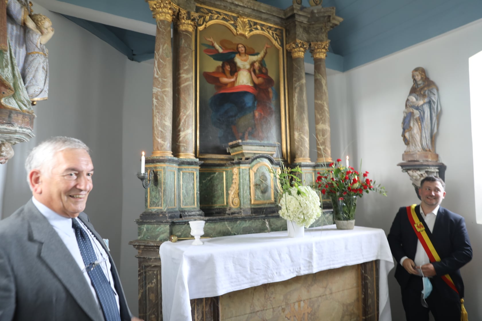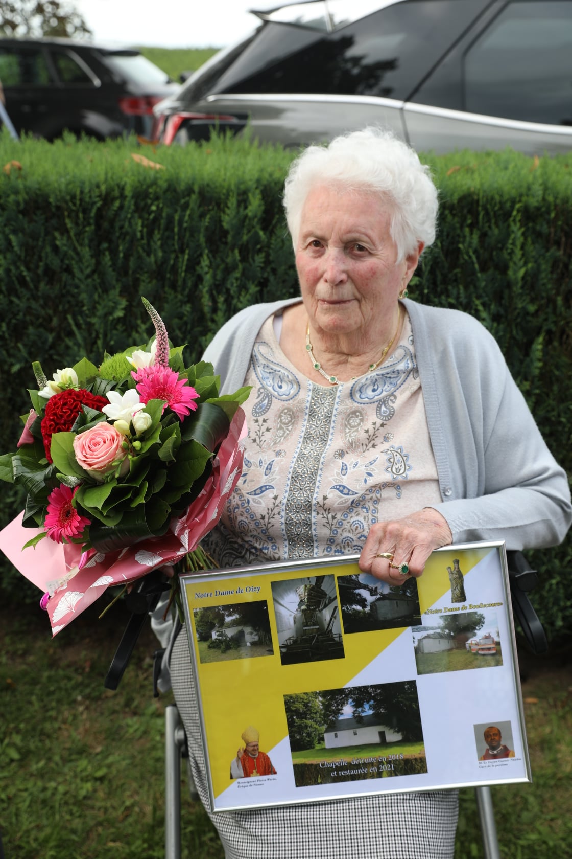 Après la messe, une procession a permis à chacun de rejoindre à pied la chapelle Notre Dame du Bon Secours. Ensuite, différents discours ont été prononcés par Michaël Modave, bourgmestre faisant fonction de la Commune de Bièvre et Sarah Lambot, employée au Centre de documentation/Bibliothèque. Dans son intervention, Monsieur Xavier de Voghel, a, quant à lui, remercié, au nom de la Fabrique d’Eglise de Oizy-Baillamont dont il est le président, « Madame Yvonne Piron, grâce à qui de très nombreux pèlerinages, de très nombreux moments de prière ont donné à ce haut lieu de notre village et de notre région une vie que nous aurons à cœur de faire perdurer encore de nombreuses années. Elle nous a transmis le flambeau non sans nous laisser bien des recommandations. Nous veillerons à ne pas trahir son empreinte à Oizy. » Un cadeau-souvenir et un bouquet de fleurs lui ont été remis. Monseigneur Warin a alors béni l’extérieur et l’intérieur de l’édifice rénové. Un tableau dont la thématique est l’Assomption de la Vierge ornait l’autel de la chapelle avant la tempête de 2018, mais, celui-ci a été dégradé par le temps mais surtout par les dégâts provoqués par la chute du tilleul. Une restauration splendide du tableau a été réalisée par l’artiste-peintre et restauratrice Marie-Marthe Haufferlin, moniale à l’Abbaye de Cordemois, non loin de Bouillon.