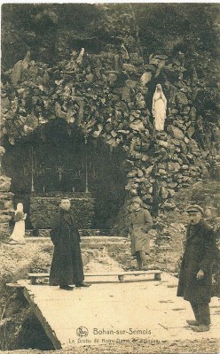 Un peu d’histoire : C’est au pied d’un escarpement qui porte le nom de la « Roche la Dame », tout à côté de la Semois, que l’abbé Jacoby, curé de Bohan a édifié la sienne. Le 14 mars 1920, il demande pour établir une grotte Notre-Dame de Lourdes au flanc de la montagne le long du canal entre le hangar Tellier et la scierie Collard. L’autorisation en est donnée. A ce moment, le canal était ouvert devant la grotte.