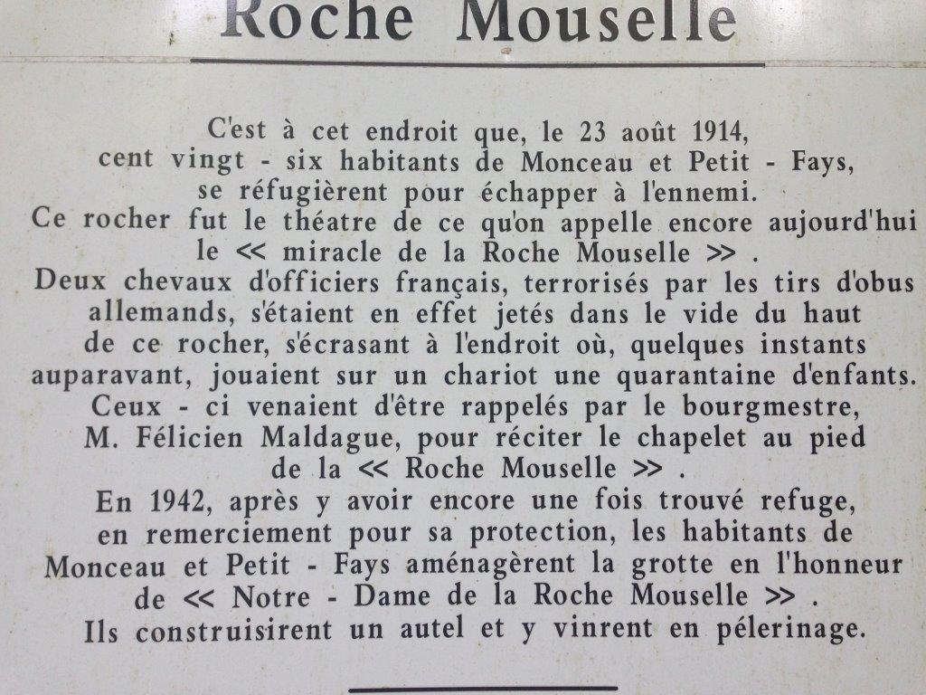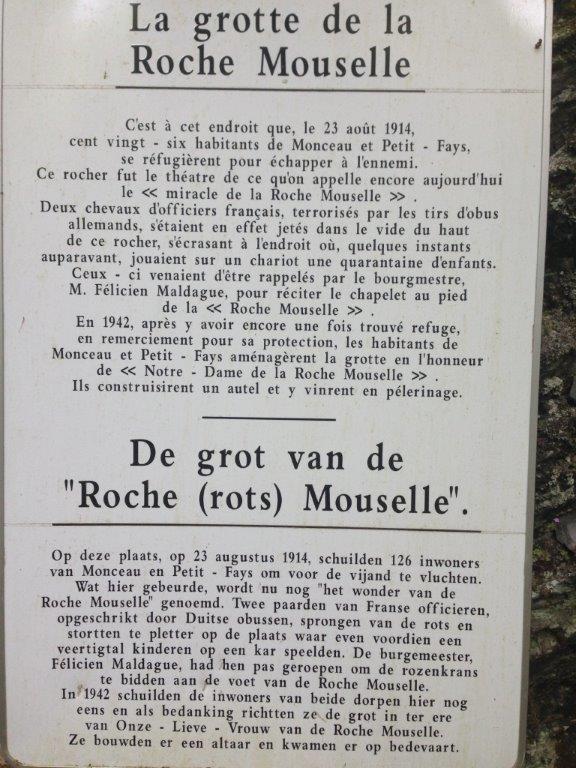 Lors de l’invasion allemande, 126 habitants de Monceau et Petit-Fays se sont enfuis dans la forêt proche, sur des chariots, transportant enfants, malades et personnes âgées. Ils y restèrent plusieurs jours, le temps que des troupes de Uhlans quittent les villages. De leur cachette, ils ne pouvaient être inquiétés par les soldats du Kaiser qui se dirigeaient vers la France toute proche. Madame Alice Martin se souvient de ce qui s’est passé le 23 août 1914, à l’aube de la première guerre mondiale. « Nous habitions le village de Monceau. Dès que l’on annonça l’arrivée imminente des envahisseurs dont on nous avait dit le plus grand mal, on nous a installés, nous les enfants, sur une charrette de M. Félicien Maldague. Son attelage, tiré par deux robustes chevaux ardennais, nous conduisit à la Roche Mouselle. Pendant ce temps, les combats avaient commencé. Le 25 août à Petit-Fays, position toujours tenue par l’armée française, deux officiers s’étaient arrêtés à l’Hôtel de la Vallée. Ils avaient attaché leurs montures à proximité de l’église toute proche. Soudain, les Allemands entreprirent de pilonner cette position. Un obus éclata prés de l’édifice religieux. Terrorisés, les deux chevaux brisèrent leurs liens et s’enfuirent à travers la campagne. La vie s’était organisée à la Roche Mouselle. Pendant que l’on préparait le repas du soir, les 40 enfants jouaient devant la grotte. M. Maldague, inquiété par le bruit des obus qui éclataient dans les villages tout proches, sortit de l’abri et nous ordonna de rentrer au plus vite pour réciter le chapelet. A peine le dernier bambin eût-il quitté le chariot, que les deux chevaux des officiers français s’écrasèrent sur l’attelage. Ils avaient couru à travers champs et bois pour déboucher au-dessus de la Roche Mouselle. Evidemment, l’invitation du mayeur à nous mettre à l’abri pour prier a été interprétée comme un signe du Ciel. Un miracle destiné à épargner les enfants qui jouaient là. Sans cela, c’est vrai, plusieurs d’entre nous perdaient la vie… » De retour dans leurs foyers, les villageois promirent de construire une grotte mariale à la Roche Mouselle. La guerre prit fin, mais rien ne fût entrepris. Ce n’est qu’en 1940, que les habitants, qui avaient à nouveau trouvé refuge à cet endroit, jurèrent d’être fidèles à leur promesse. On entreprit donc l’aménagement de la grotte en 1942. Elle fut restaurée en 1998 par des bénévoles du Syndicat d’Initiative et quelques personnes de Petit-Fays. Depuis cette date, une messe y est célébrée le dernier dimanche de septembre.